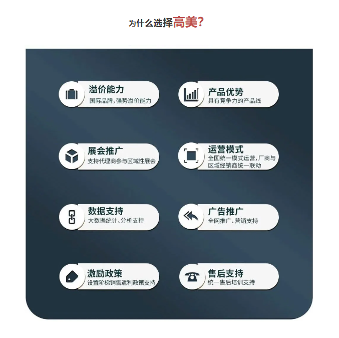 支持渠道打造精品智慧展廳,即【高美智慧清潔體驗館】,提升用戶體驗,線上線下一體化運營,全國渠道一張網(wǎng)。借助智慧清潔體驗館,系統(tǒng)提升品牌和渠道服務(wù)水準(zhǔn)和競爭力。