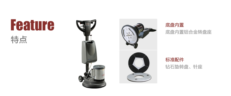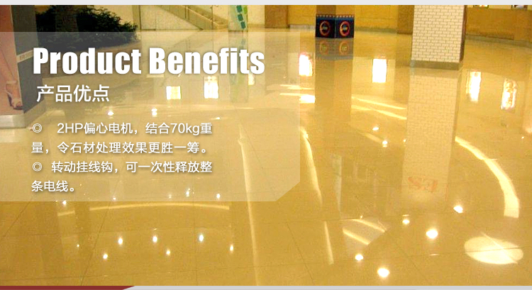 根據(jù)力學(xué)原理采用偏心電機(jī)設(shè)計(jì),結(jié)合底盤(pán)內(nèi)置鋁合金轉(zhuǎn)盤(pán)座設(shè)計(jì),讓操作更輕便;70kg機(jī)器凈重,2HP電機(jī)扭力強(qiáng)大,令石材處理效果更勝一籌;專為石材翻新和晶面處理而設(shè)計(jì)。適合賓館、酒店等大面積鋪設(shè)石材的場(chǎng)所。